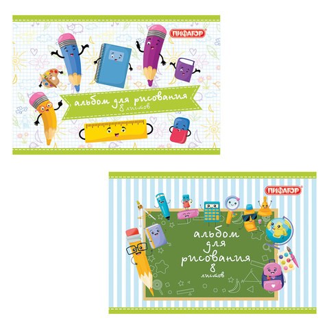 Альбом для рисования, А4, 8 л., скоба, обложка офсет, ПИФАГОР, 200х285 мм, "Веселые карандаши" (2 вида), 104851