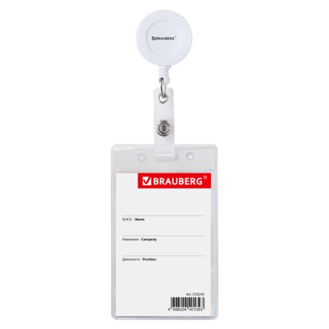 Вертикальный бейдж BRAUBERG на держателе-рулетке используется для размещения именных карточек, пропусков, пластиковых карт.