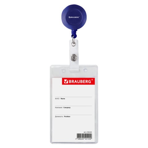 Вертикальный бейдж BRAUBERG на держателе-рулетке используется для размещения именных карточек, пропусков, пластиковых карт.