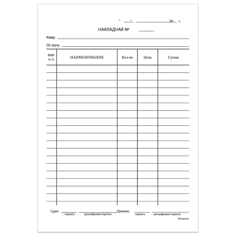 Бумага офсетная плотностью 60 г/м2. Внутренний блок проклеен по одному краю. В накладной указывается количество товара, количество, цена, сумма. Формат А5 (135х195 мм). Поставляется в виде книжки в количестве 100 штук в термоусадочной пленке.