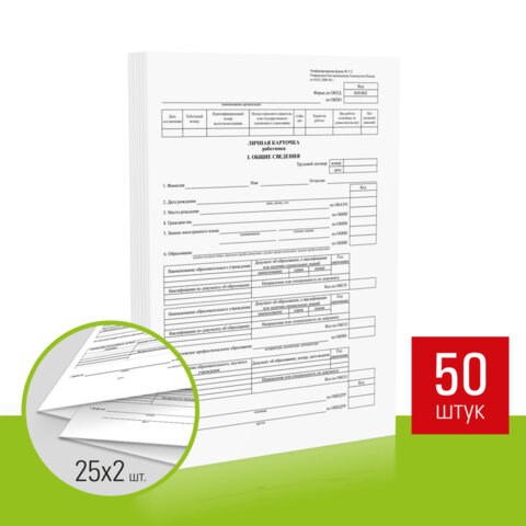 Бланк бухгалтерский, офсет плотный, "Личная карточка работника", форма Т-2, А4, 2 л., КОМПЛЕКТ 50 шт., STAFF, 130201