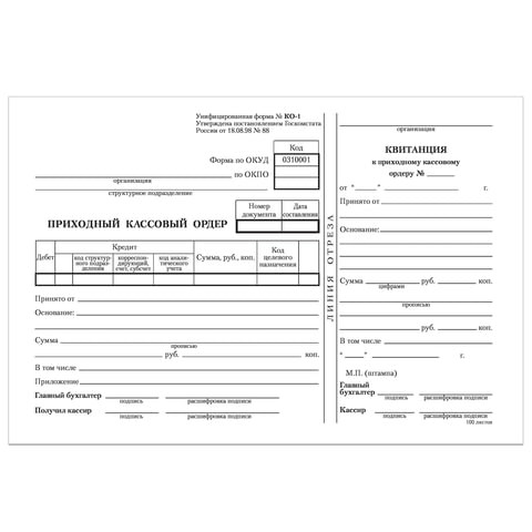 Бланк бухгалтерский, офсет, "Приходный кассовый ордер", А5 (135х195 мм), СПАЙКА 100 шт., BRAUBERG/STAFF, 130131