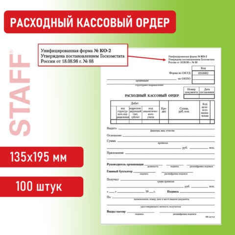 Бумага офсетная плотностью 60 г/м2. Внутренний блок проклеен по одному краю. Бланк выполнен по унифицированной форме № КО-2. Формат А5 (135х195 мм). Поставляется в виде книжки в количестве 100 штук в термоусадочной пленке. Соответствует государственным стандартам документального ведения учета.