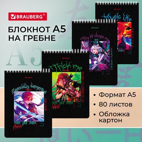 Блокнот А5 (146х206 мм), 80 л., гребень, картон, клетка, BRAUBERG, "Аниме", 114375