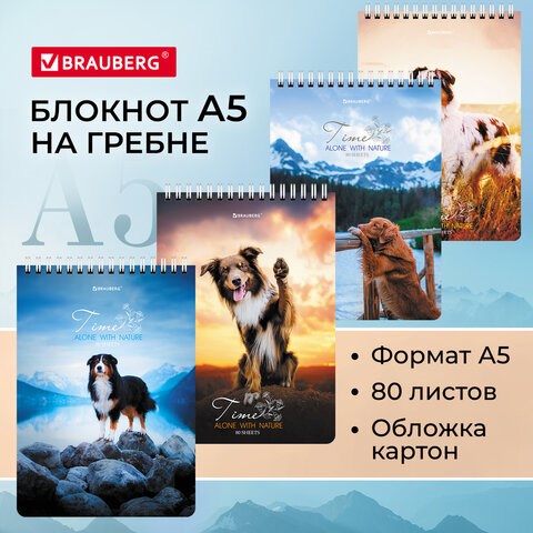 Блокнот А5 (146х206 мм), 80 л., гребень, картон, клетка, BRAUBERG, "Грациозные собаки", 114376