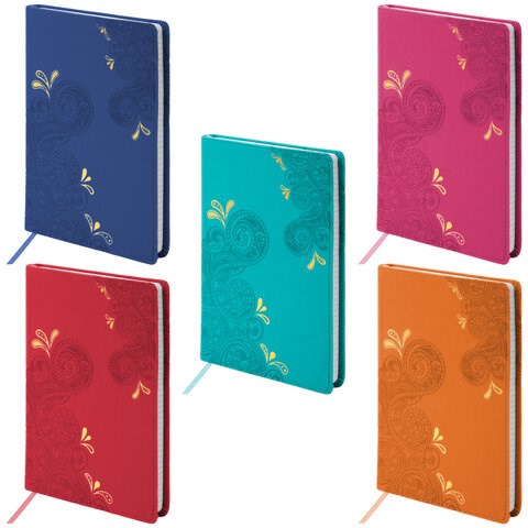 Мягкая интегральная обложка стилизована под кожу и украшена изящным тиснением, а также декорирована фольгой. Имеет закругленные уголки и прошита по периметру. Подходит для горячего тиснения. 128 листов позволят зафиксировать большой объем информации. Линовка блока в клетку дает возможность аккуратно заполнить цифровые значения, а также нанести чертежные зарисовки. Внутренний блок выполнен из офсета белого цвета плотностью 70 г/м2 и крепится к обложке с помощью книжного переплета. Дополнением является закладка-ляссе, с помощью которой при необходимости можно быстро открыть нужную страницу. Формат блокнота А5 (148х218 мм) позволит владельцу поместить его в кейс или сумку малых габаритов. Поставляется в нескольких вариантах цвета (без возможности выбора).