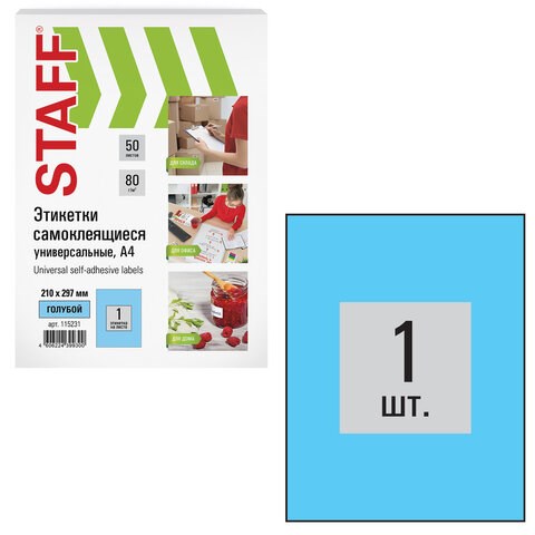 Этикетка самоклеящаяся 210х297 мм, 1 этикетка, голубая, 80 г/м2, 50 листов, STAFF, 115231