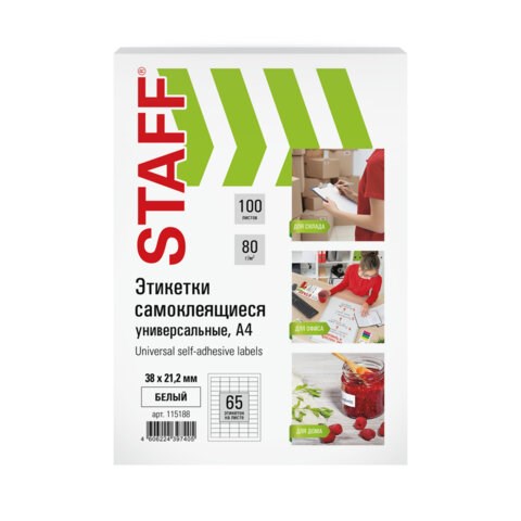 Этикетка самоклеящаяся 38х21,2 мм, 65 этикеток, белая, 80 г/м2, 100 листов, STAFF, 115188