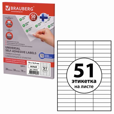 Этикетка самоклеящаяся 70х16,9 мм, 51 этикетка, белая, 70 г/м2, 50 листов, BRAUBERG, сырье Финляндия, 129256