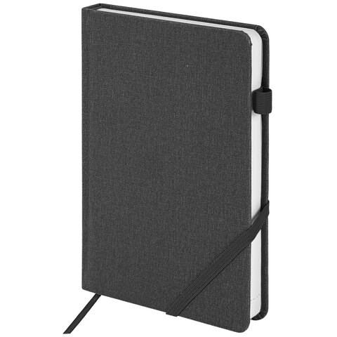 Внутренний блок включает 136 листов белой бумаги плотностью 70 г/м2. Каждая страничка имеет перфорированный угол. Благодаря стандартному формату А5 ежедневник удобно брать с собой. Твердая обложка, стилизованная под ткань, подходит для горячего тиснения. Снабжен резинкой-фиксатором, благодаря чему ежедневник не откроется в сумке или портфеле.