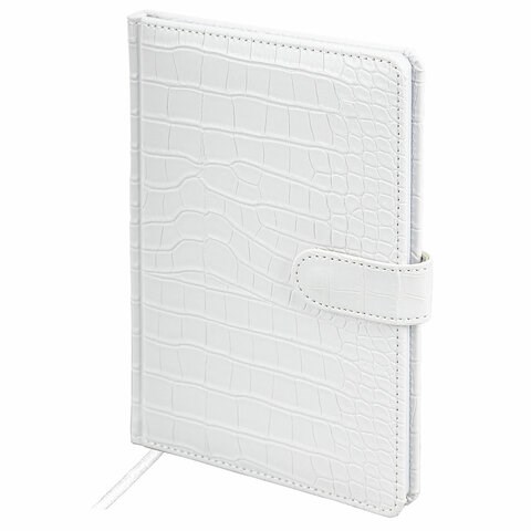 Внутренний блок включает 64 листа тонированной бумаги плотностью 70 г/м2. Благодаря стандартному формату А5 еженедельник удобно использовать как в офисе, так и на выездных деловых встречах. Твердая обложка, стилизованная под кожу крокодила, фиксируется магнитной застежкой, поэтому еженедельник не откроется в сумке или портфеле и страницы не помнутся. Подходит для горячего тиснения. Дополнением является закладка-ляссе, с помощью которой при необходимости можно быстро открыть еженедельник на нужной странице. Помимо прочего, еженедельник снабжен обширным справочным материалом. Выполнен в белом цвете.