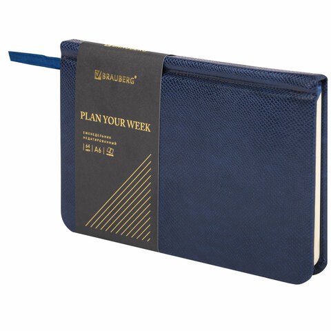 Внутренний блок включает 64 листа тонированной бумаги плотностью 70 г/м2. Благодаря малому формату А6 (95х155 мм) еженедельник удобно использовать как в офисе, так и на выездных деловых встречах. Твердая обложка, стилизованная под кожу рептилии, подходит для горячего тиснения. Дополнением является закладка-ляссе, с помощью которой при необходимости можно быстро открыть еженедельник на нужной странице. Помимо прочего, еженедельник снабжен обширным справочным материалом. Выполнен в благородном синем цвете.