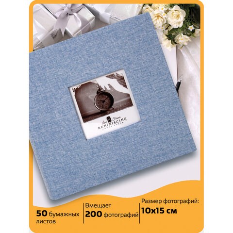 Состоит из 50 бумажных листов размером 15,5х21 см с карманами и вмещает 200 фотографий размером 10х15 см по 2 штуки на странице. Обложка фотоальбома выполнена из текстильного материала - джинсовой ткани. Фотоальбом с книжным переплетом отличается повышенной прочностью и долгим сроком службы. Размер - 22х22 см. Размер окошка под фото на обложке - 8,5х8,5 см.