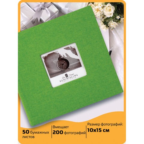 Состоит из 50 бумажных листов размером 15,5х21 см с карманами и вмещает 200 фотографий размером 10х15 см по 2 штуки на странице. Обложка фотоальбома выполнена из текстильного материала зеленого цвета. Фотоальбом с книжным переплетом отличается повышенной прочностью и долгим сроком службы. Размер - 22х22 см. Размер окошка под фото на обложке - 8,5х8,5 см.