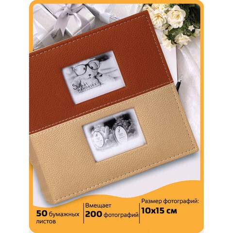 Состоит из 50 бумажных листов размером 15,5х21 см с карманами и вмещает 200 фотографий размером 10х15 см по 2 штуки на странице. Обложка фотоальбома выполнена из материала под кожу коричневого и бежевого цветов. Фотоальбом с книжным переплетом отличается повышенной прочностью и долгим сроком службы. Размер - 22х22 см. Размеры окошек под фото на обложке - 8х6 см.