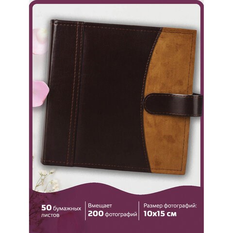 Состоит из 50 бумажных листов размером 15,5х21 см с карманами и вмещает 200 фотографий размером 10х15 см по 2 штуки на странице. Обложка фотоальбома скомбинирована из материалов под глянцевую кожу и замшу в коричневых тонах, которая украшена застежкой на липучке. Фотоальбом с книжным переплетом отличается повышенной прочностью и долгим сроком службы. Имеются поля для подписей. Размер - 20,7х21,8 см.