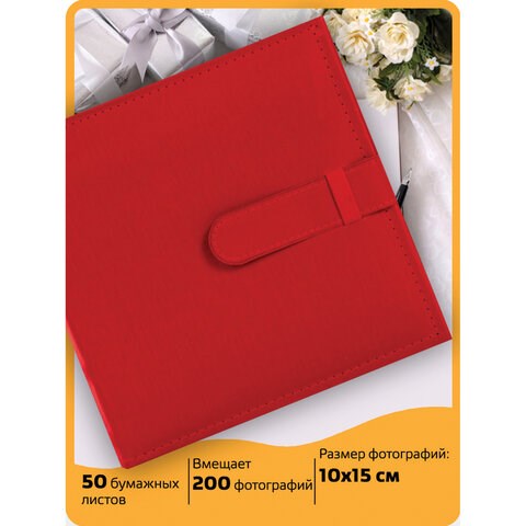 Состоит из 50 бумажных листов размером 15,5х21 см с карманами и вмещает 200 фотографий размером 10х15 см по 2 штуки на странице. Имеются поля для записей. Обложка фотоальбома стилизована под кожу красного цвета. Фотоальбом с книжным переплетом отличается повышенной прочностью и долгим сроком службы. Размер - 30х26 см.
