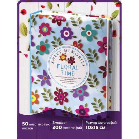 Фотоальбом BRAUBERG на 200 фото 10х15 см, твердая обложка, "Цветочки", разноцветный, 391119