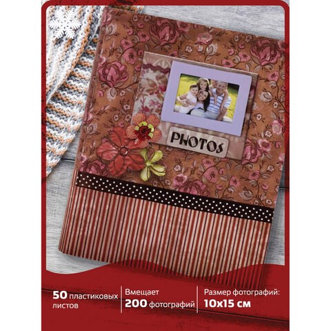 Фотоальбом BRAUBERG на 200 фотографий 10х15 см, твердая обложка, "Семья", бокс, красно-коричневый, 390673