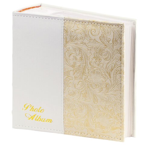 Состоит из 75 бумажных листов размером 15,5х21 см с карманами и вмещает 300 фотографий размером 10х15 см, по 2 штуки на странице. Обложка фотоальбома скомбинирована из материалов под гладкую и фактурную кожу белого и золотистого цвета. Фотоальбом с книжным переплетом отличается повышенной прочностью и долгим сроком службы. Имеются поля для подписей. Размер – 20,7х21,8 см.