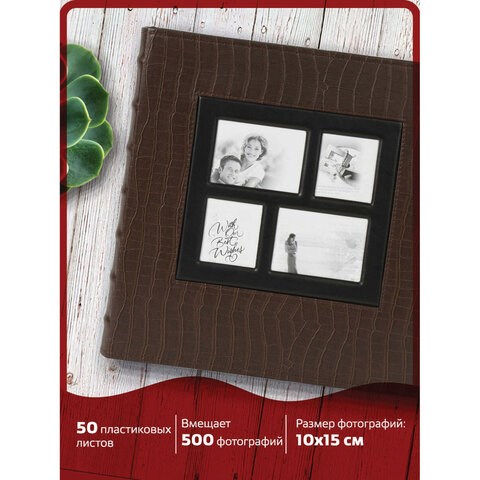 Фотоальбом BRAUBERG на 500 фотографий 10х15 см, обложка под кожу крокодила, рамка для фото, коричневый, 390715
