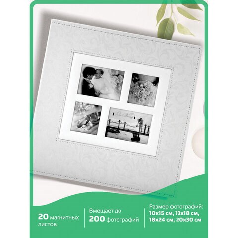 Фотоальбом BRAUBERG свадебный, 20 магнитных листов 30х32 см, обложка под фактурную кожу, на кольцах, белый, 390691