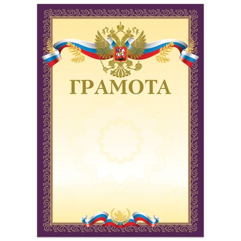 Грамота А4, мелованный картон, конгрев, тиснение фольгой, пурпурная, BRAUBERG, 126547