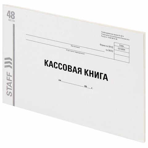 Кассовая книга Форма КО-4, 48 л., А4 (292х200 мм), альбомная, картон, типографский блок, STAFF, 130231