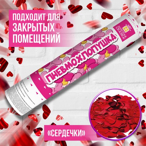 Хлопушка пневматическая ЗОЛОТАЯ СКАЗКА "СЕРДЕЧКИ" 30 см, фольга, сердечки, красный, 591475