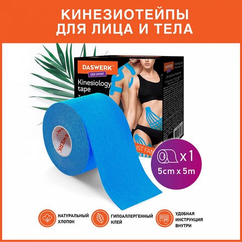 Кинезио тейп/лента для лица и тела, омоложение и восстановление, 5 см х 5 м, синий, DASWERK, 680007