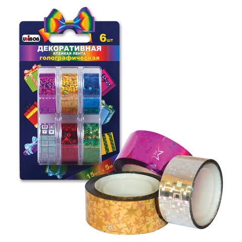 Клейкие ленты 15 мм х 5 м, декоративные голографические, UNIBOB, комплект 6 шт., ассорти, 51717