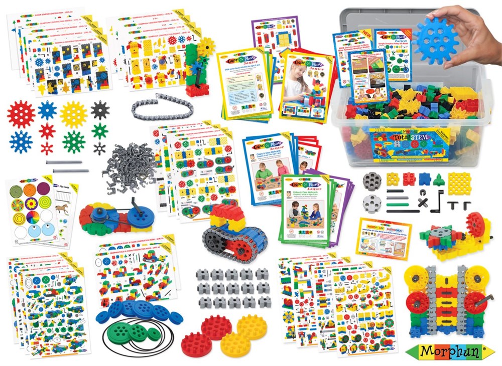 В набор конструктора Morphun® Total STEM Полный STEM 400 деталей входят 27 двусторонних листов формата А3 с инструкциями разных уровней сложности по сборке механических устройств, включающих шестеренчатые, ременные, цепные, реечные передачи, 5 наборов рабочих карт в помощь педагогам для подготовки и проведения занятий, стикеры и двусторонние разрезные карточки.
