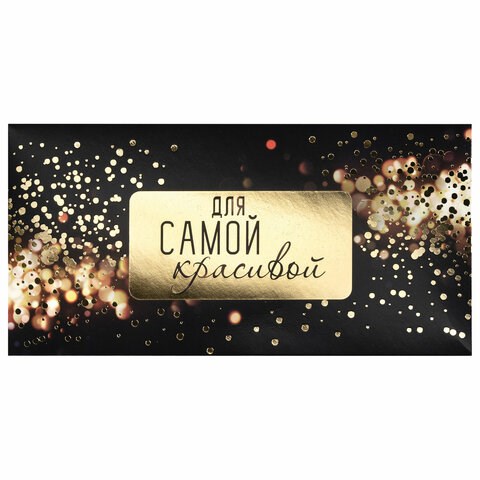 Конверт с надписью "ДЛЯ САМОЙ КРАСИВОЙ" изготовлен из высококачественного картона плотностью 215 г/м2. Выполнен в темных оттенках с золотистым принтом. Отделка - фольга. Размер - 166х82 мм.