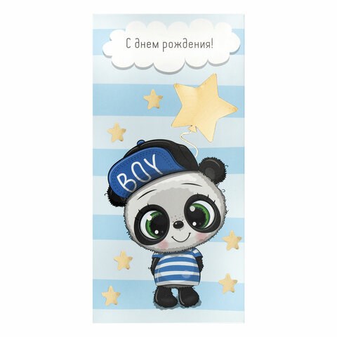Конверт с надписью "С ДНЁМ РОЖДЕНИЯ!" изготовлен из высококачественного картона плотностью 215 г/м2. Выполнен в голубых оттенках с изображением панды-мальчика. Отделка - фольга. Размер - 166х82 мм.