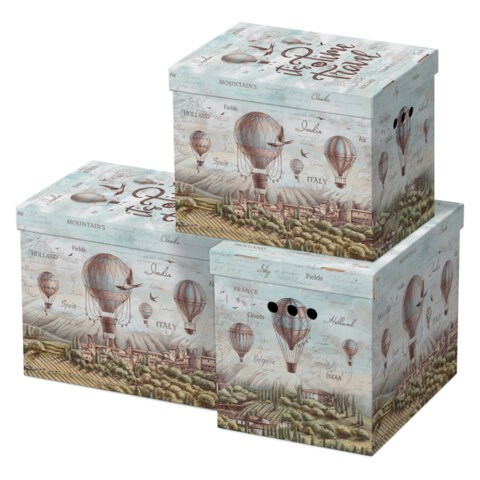 В комплект входят 3 короба размером 38 х 28 х 31,5 см со съемными крышками, изготовленные из плотного экологичного микрогофрокартона толщиной 1,6 мм. Короб отлично держит форму, а для удобства перемещения на боковых сторонах имеются декоративные отверстия. Разноцветный рисунок в виде темы путешествий не позволит коробам затеряться на полках и стеллажах в вашей квартире или офисе. Для обеспечения сохранности поставляются в разобранном виде. Пошаговую схему сборки можно найти на обратной стороне вкладыша.