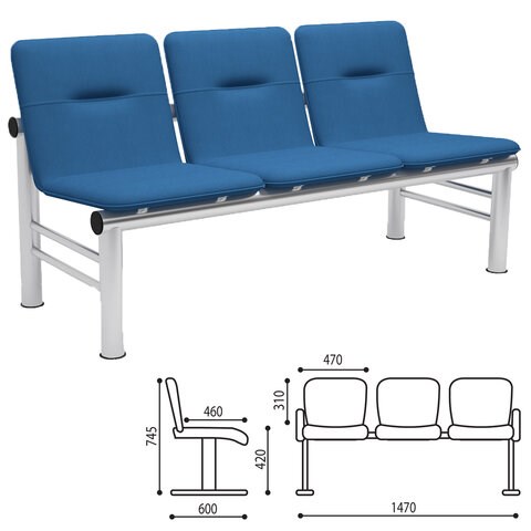Кресло для посетителей трехсекционное "Троя", 755х1470х590 мм, светлый каркас, кожзам синий, СМ 105-03 К20