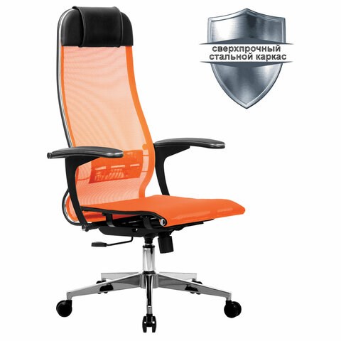 Кресло офисное МЕТТА "К-4-Т" хром, прочная сетка, сиденье и спинка регулируемые, оранжевое