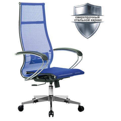 Кресло офисное МЕТТА "К-7" хром, прочная сетка, сиденье и спинка регулируемые, голубое
