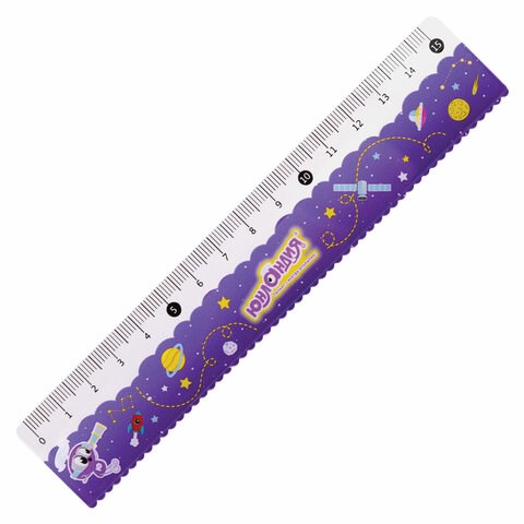 Линейка из прозрачного пластика c волнистым краем и принтом в виде космического пространства. Имеет безопасные закруглённые углы. Длина шкалы составляет 15 см. Линейка обладает четкой разметкой, что делает ее удобной в использовании. Упакована в пакет с европодвесом.