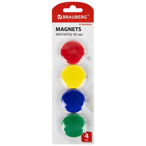 Магниты БОЛЬШОГО ДИАМЕТРА 40 мм, НАБОР 4 шт., ассорти, BRAUBERG "STANDARD", 237470