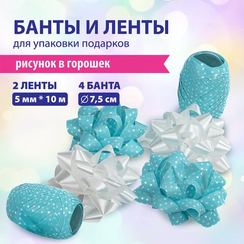 Набор для декора и подарков 4 банта, 2 ленты, горошек, цвета: белый, голубой, ЗОЛОТАЯ СКАЗКА, 591845