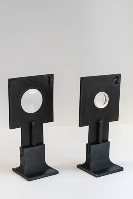 Набор состоит из двух рассеивающих линз с разными значениями оптической силы (фокусным расстоянием) на подставке.