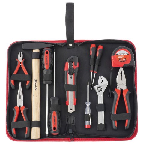 Набор инструментов из 12 предметов. В комплект входят: длинногубцы, отвертка-тестер, пассатижи, молоток слесарный 200 г, отвертки SL 6 х 150 мм, РН 2 х 150 мм, две часовые отвертки; кусачки мини, ключ разводной, нож технический, рулетка.
