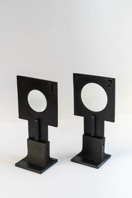 Набор состоит из двух собирающих линз с разными значениями оптической силы (фокусным расстоянием) на подставке.