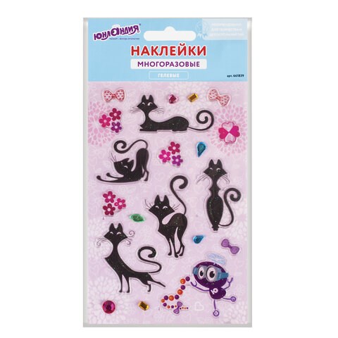 В наборе содержатся блестящие гелевые наклейки с изображением кошек и сверкающие акриловые стразы в количестве 20 штук. Наклейки отличаются высочайшим качеством печати и цветопередачи. Изящные чёрные кошки и стразы в виде драгоценных камней украсят тетради, дневники, гаджеты и поделки, придавая им изысканный вид.