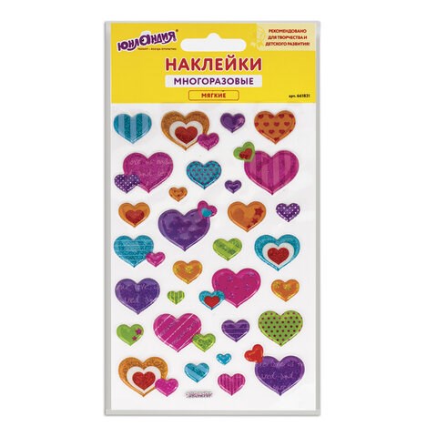 Наклейки зефирные "Сердца", многоразовые, с блестками, 10х15 см, ЮНЛАНДИЯ, 661831