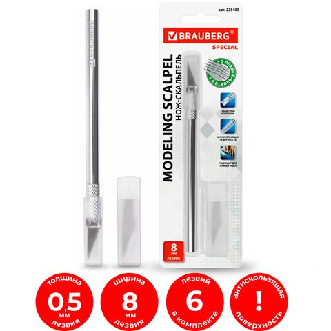Нож макетный (скальпель) BRAUBERG "Special", 6 лезвий в комплекте, металлический корпус, блистер, 235405