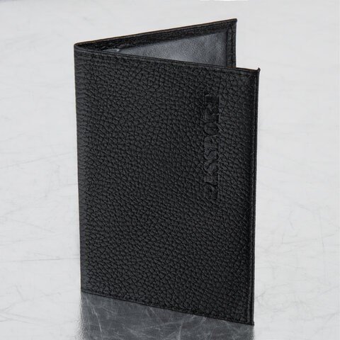 Модель выполнена из натуральной кожи "флоттер" насыщенного чёрного цвета, что подчеркнет стиль и изысканный вкус обладателя. На внутреннем развороте расположены два кармана из прозрачного пластика, а также дополнительный кожаный карман в виде уголка. Упакована в пакет с европодвесом.