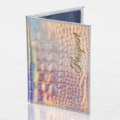 Модель выполнена из натуральной кожи серебристого цвета с блестками и украшена тисненой надписью "Паспорт". Имеет простроченные края. На внутреннем развороте расположены два кармана из прозрачного пластика. Благодаря компактным размерам 97х138 мм удобно всегда носить с собой.