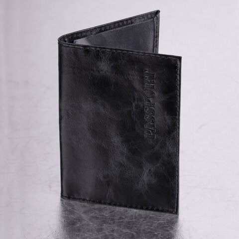 Модель выполнена из натуральной кожи "пулап" чёрного цвета, что подчеркнет стиль и изысканный вкус обладателя. Украшена тиснением "Passport", края прострочены. На внутреннем развороте расположены: с левой стороны - кожаный карман с отделениями для пластиковых карт, с правой стороны - карман из прозрачного пластика. Упакована в пакет с европодвесом.